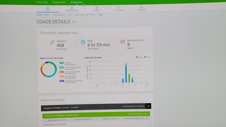 她以workbook為主,先確定主題,然後利用”可汗” ” YouTube” “Mathletics” 三個平台,學習該主題並且做好筆記,然後再回到workbook去完成練習題,接著從IXL找出相關的練習,結束之後進去IXL中的Analytics頁面,把自己做錯的部分存成PDF檔,隔天再拿出筆記來補強,一個禮拜之後同樣的IXL題庫在練習一遍。