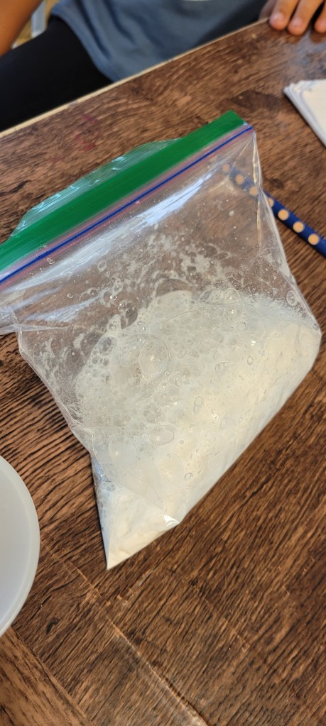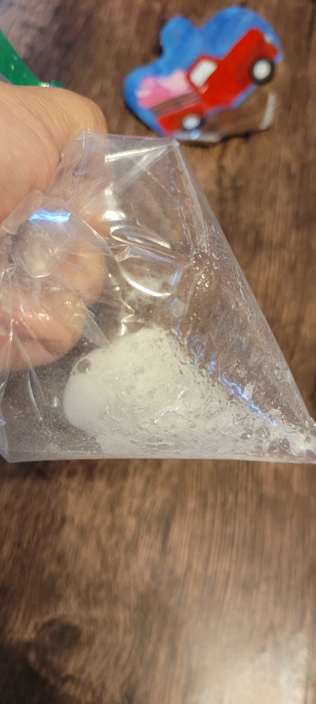 我們拿了三個保鮮袋,在每一個袋子裡分別放入 一湯匙 / 二湯匙 / 三湯匙的小蘇打粉,然後把保鮮袋先關好留一個小洞,放入漏斗,再倒入同等量的醋,看看哪一個會剛剛好? 哪一個會不夠? 哪一個會爆炸?