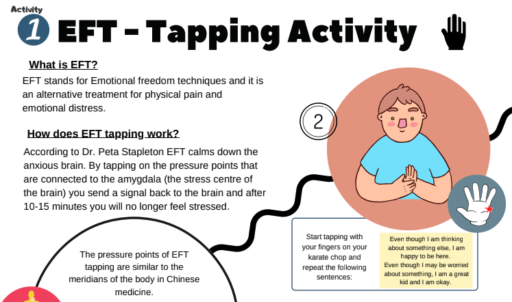 我第一次在小朋友的Worksheet中看到Emotional Freedom Technique (EFT),真是太讓我驚訝了,這是一個很重要也很有用的小技巧,至少對我跟我家老大來說這個非常實用,跟我一起搭過飛機的朋友應該看我使用過,我不是一個容易緊張的人,但是緊張的時候不容易穩定下來,這個時候EFT就很重要了呢!