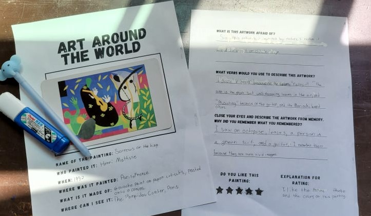 姊妹倆還有在自學學校拿過世界名畫的課,她們兩個滿喜歡這堂課的,每個禮拜老師會介紹一個有名的畫作,然後回家後我們會上網找相關資料,再一人發一張問題頁,讓姊妹倆動動腦,想想看該怎樣回答問題。