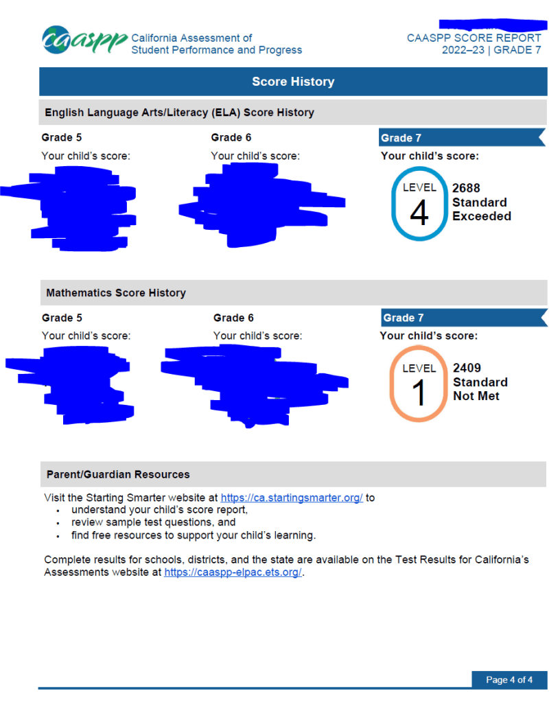 CAASPP score report有四頁,第三頁是數學考試的成績。