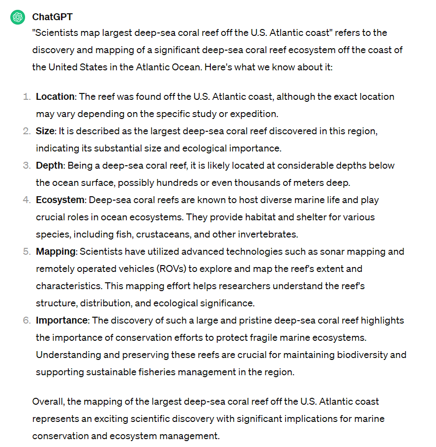 閱讀並理解文章 (比如說這篇新聞 Scientists map largest deep-sea coral reef off the U.S. Atlantic coast,仔細閱讀完之後,進入ChatGPT 打入 What do we know about “Scientists map largest deep-sea coral reef off the U.S. Atlantic coast”? 然後ChatGPT就會跳出…..